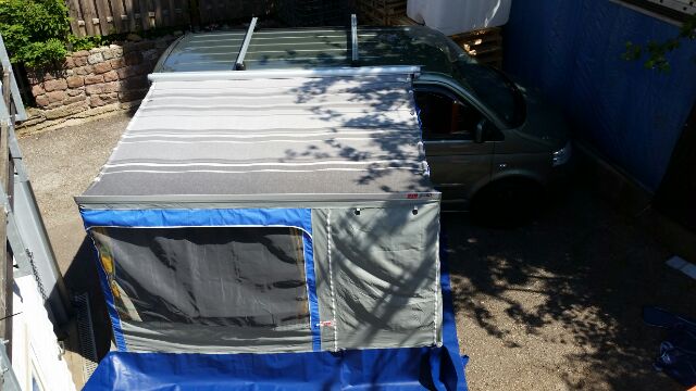 das gebraucht erworbene Vorzelt aufgebaut und mit Frauchen
