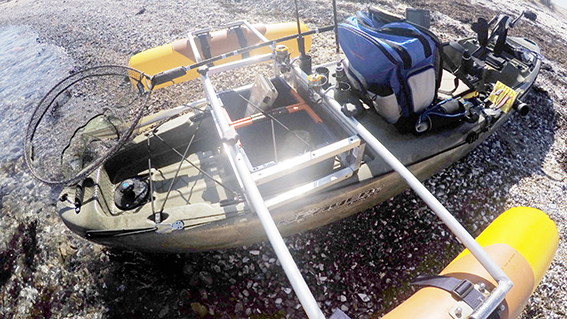 Mit den Auslegern kann'ste Rumba drauf tanzen :-) Die aufblasbaren Schwimmkörper sind Bootsrollen welche auf zurechtgeschnittenen KG-Rohren mittels Riemen befestigt sind. Den Rucksack hab ich vom Flohmarkt, innen für passive Kühlung beschichtet und wasserdicht! Will ich nie wieder missen!! Die Köderhalter am RH finde ich ebenfalls sehr hilfreich - gebaut aus Vorfachaufwicklern auf eine VA-Platte geklebt und mit Kabelbindern befestigt.