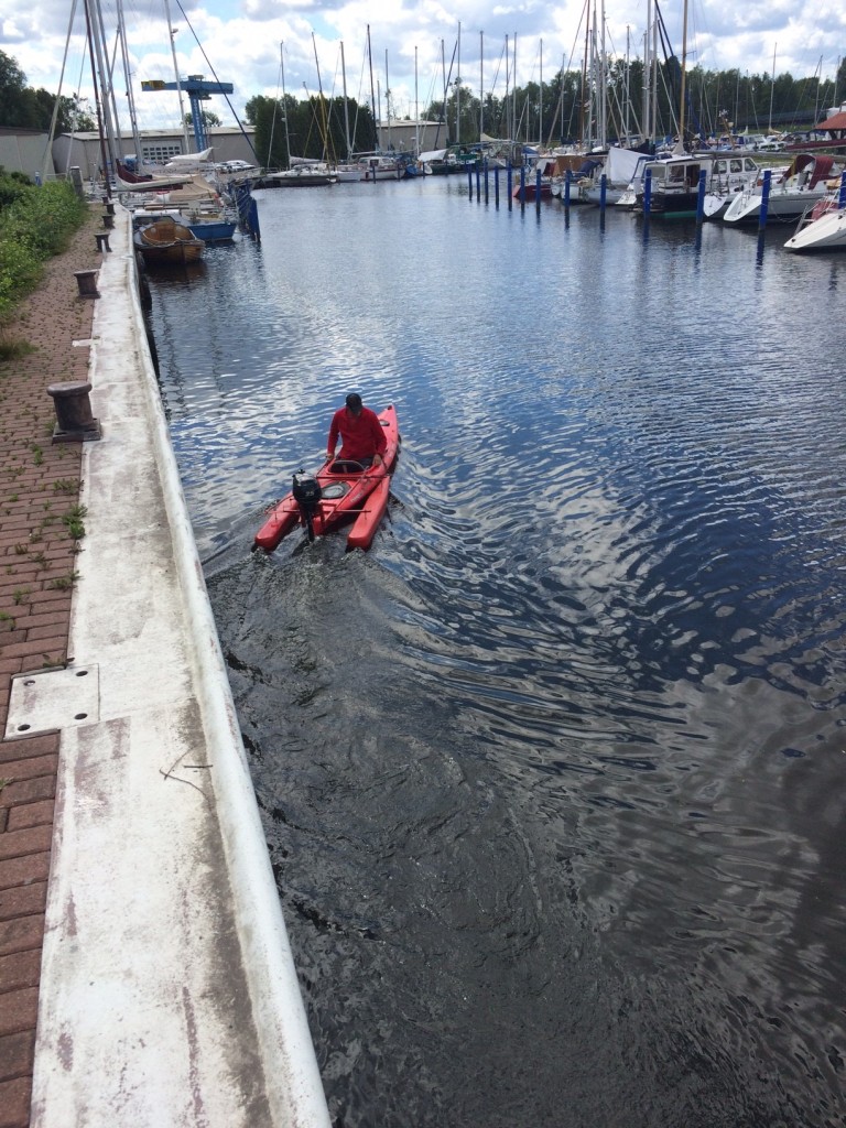 Ich habe noch kurz mit dem Herren reden können. Er sagt er fährt 3 Stunden mit ca. 1 Liter, die Ausleger sind selbst gebaut und aus Styrodur armiert mit Glasfasermatten, Abstand der Ausleger kann noch vergrößert werden, da verschiebbar, die Lenkung erfolgt linke Seite über die lange Stange nach vorn, rechts über Seilzug nach vorn, außerdem finde ich sehr gut, das er sich eine Fernbedienung mit Gaszug und Abrisssicherung rechts neben den Sitz gebaut hat. Bemerkenswerte alternative Idee zu vielen Dingen die im Handel zu erwerben sind. Natürlich steckt da auch ein Winter Arbeit drin. Aber ich sah den Herren noch losfahren, und dass sehr zügig.