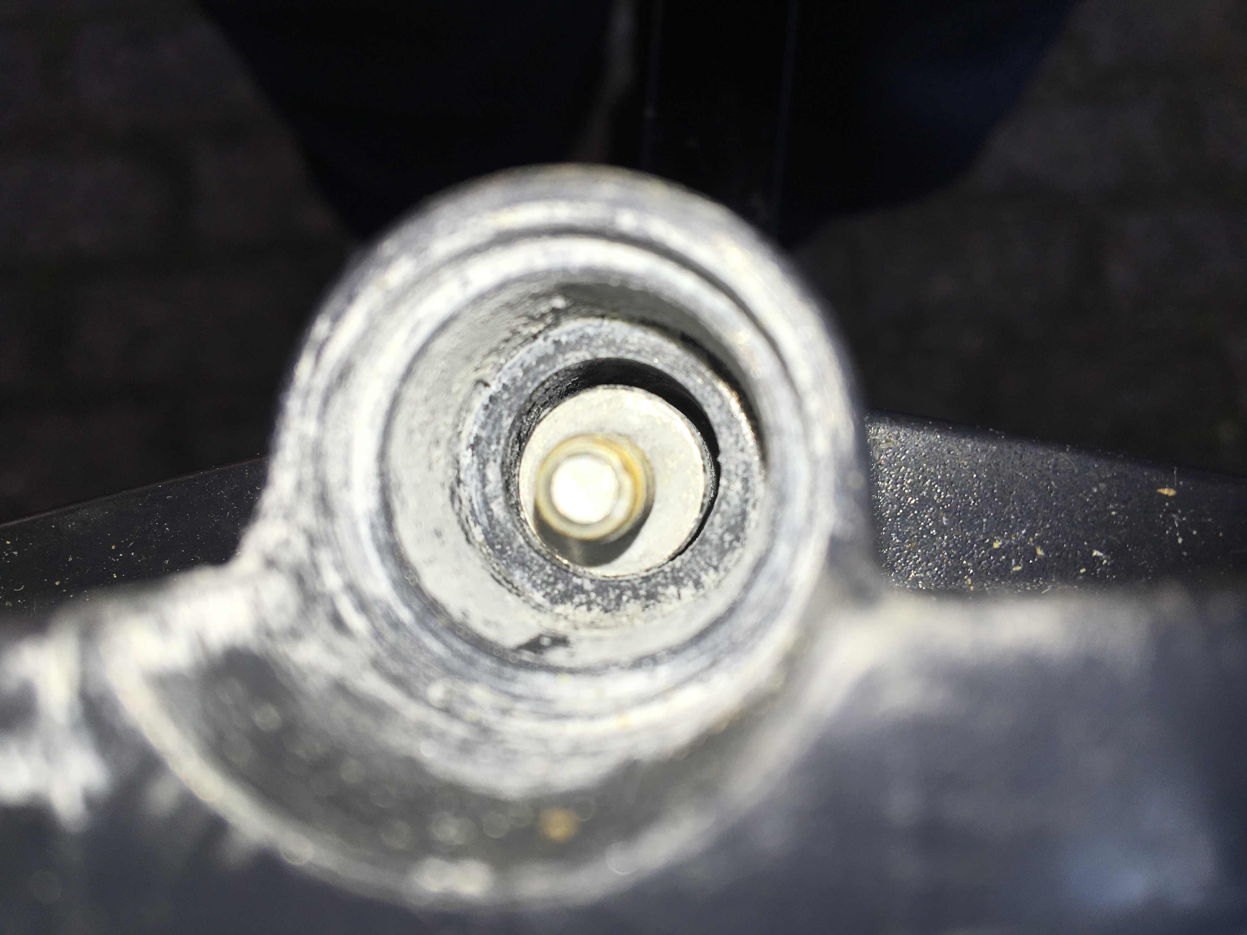 Arm mit Pedalachse : Wie man deutlich erkennen kann ist der schwarze Arm rund um die Edelstahlachse zerfressen.