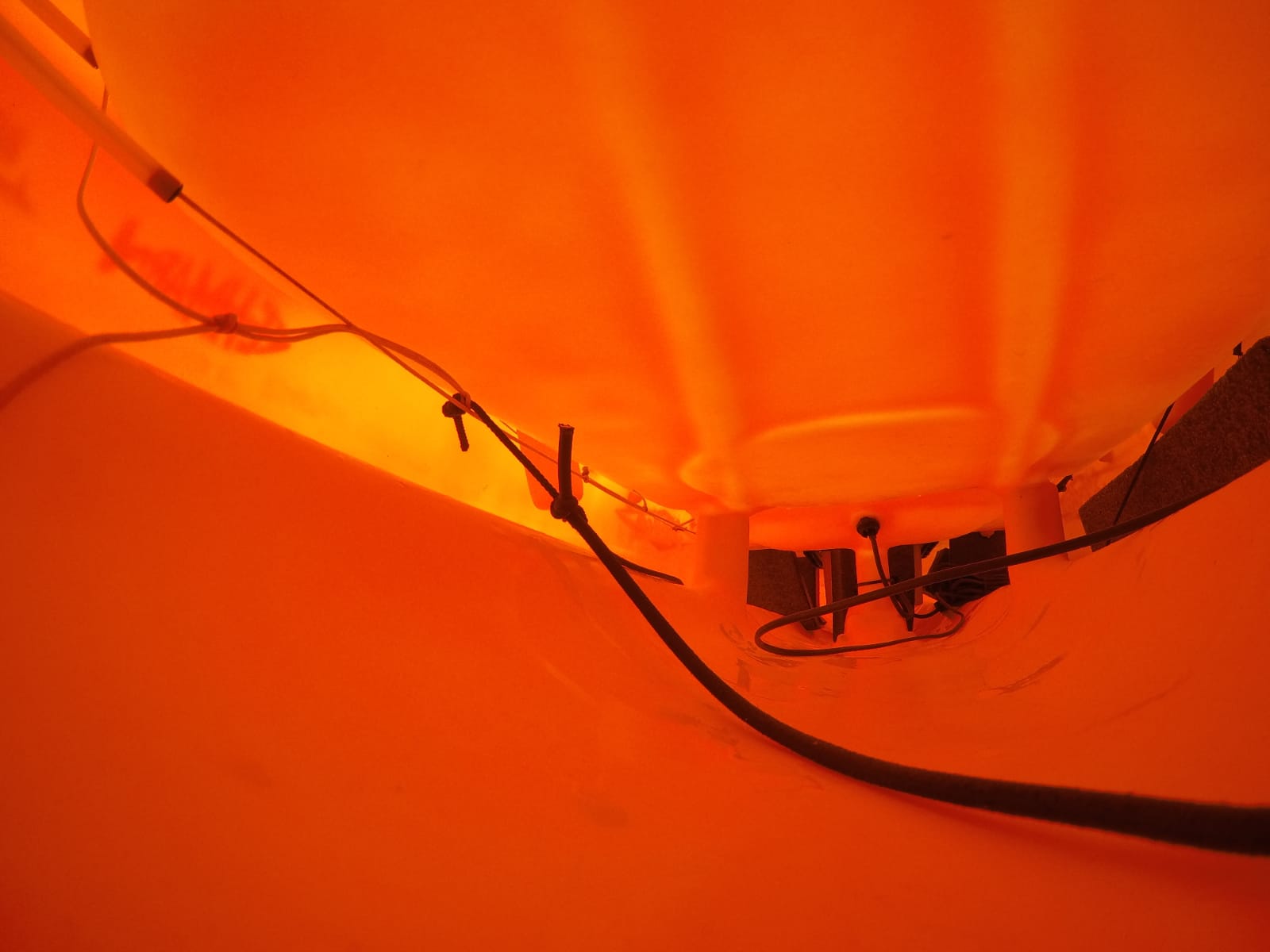 Hab gerade mal mit der GoPro die Regenpause genutzt. Scheinbar scheint die Befestigung des Gummis, was für die Spannung auf den beiden Griffen sorgt defekt zu sein. Ich habe auch einen Teil eines gebrochenen Sifts im Rumpf auf Höhe der mittleren Luke gefunden.