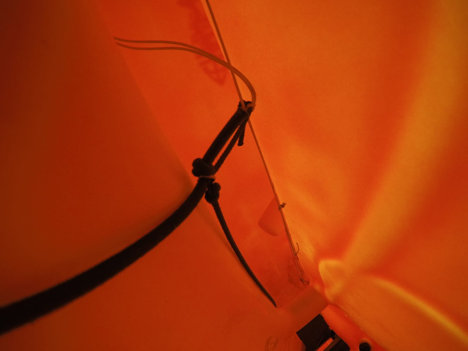So hab ein paar Fotos gemacht. Es ist das Gummi was an der Ruder runter Seite dafür sorgt, dass alles unter Spannung bleibt. Das ganze war mit einem Metallring an der Ruder runter Leine befestigt. Leider weiß ich nicht wo.
