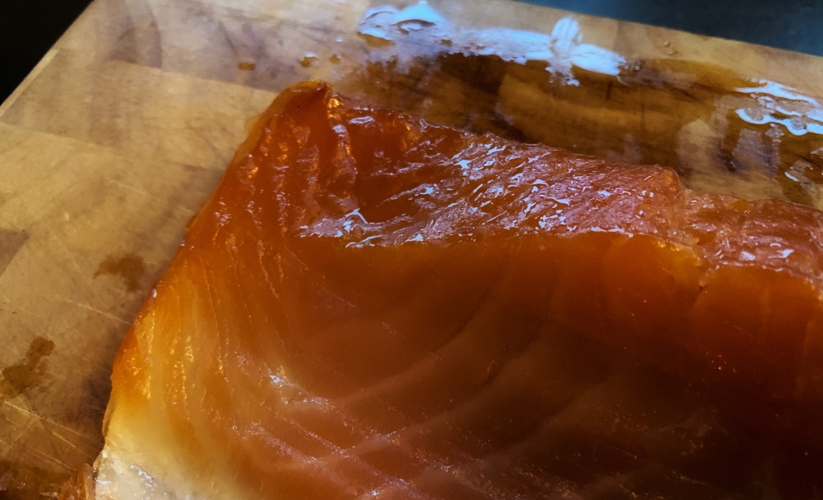 Kleines Missgeschick ist mir natürlich auch passiert, da ich zuerst das Kondensat / Teeressig nicht auf dem Schirm hatte, sind mir zwei Tropfen aufs Schwanzende gefallen. Hab dann ne Pappe ganz oben in den Ofen gesteckt, so dass dann im Anschluss alles darauf tropfen konnte. Hoffentlich ist der Lachs dadurch jetzt nicht total versaut bzw. sauer im Geschmack geworden ...
