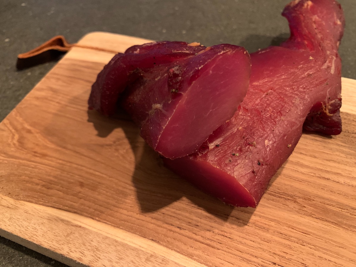 Deutlich weniger Zucker (minus 90%) in der Pökelmasse, deutlicher länger gepökelt (drei Wochen anstatt sieben Tage), dann mit zwei Tagen bei 5 Grad doppelt so lange durchgebrannt und anschließend bei 16 Grad noch drei weitere Tage getrocknet (hatte ich beim Bacon gar nicht gemacht). Zusätzlich ist jetzt eine Temperatursteuerung über den InkBird am Start, so dass ich konstant 15-20 Grad im Ofen habe
