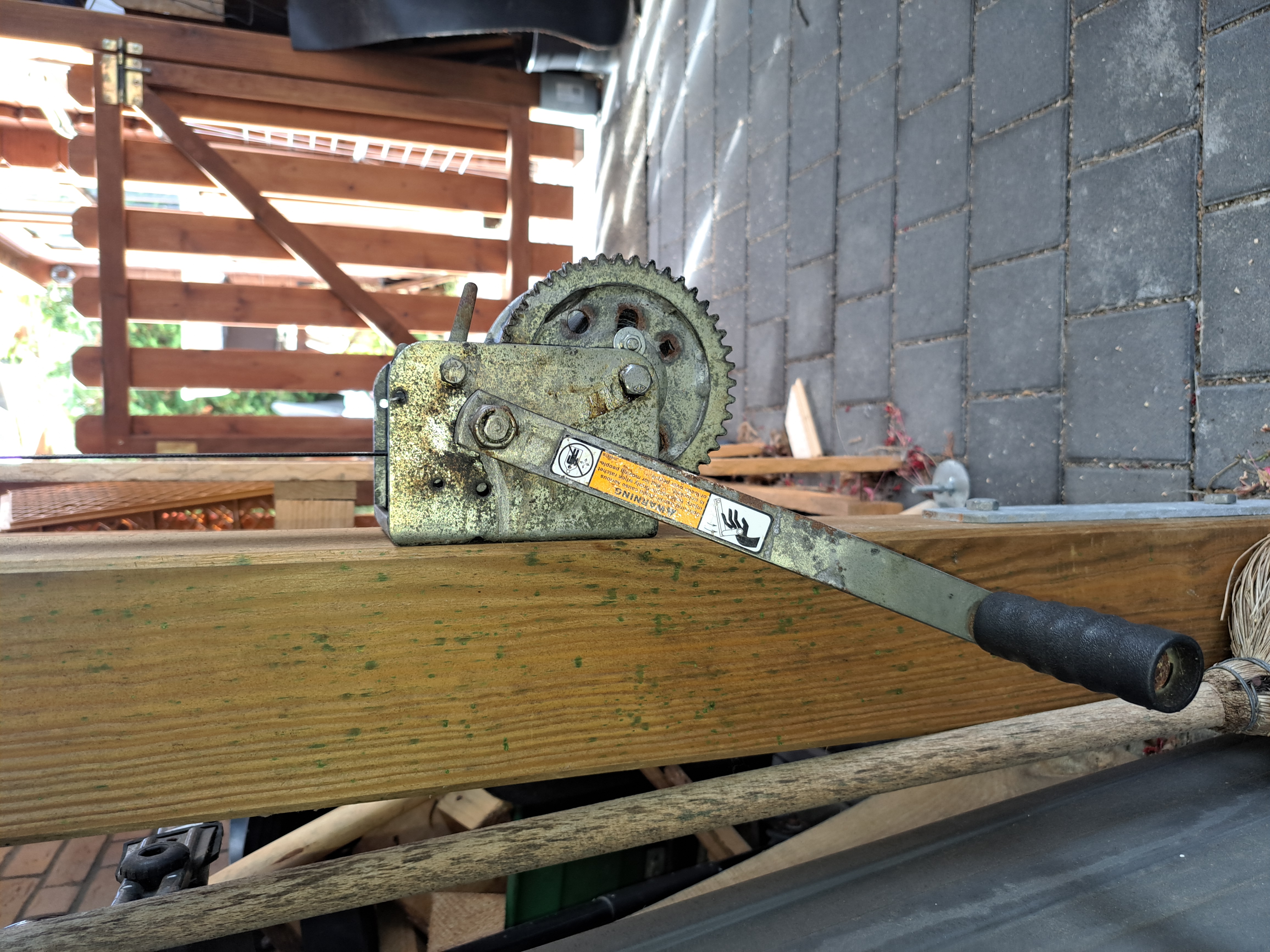 Ein Winterprojekt ist u.a. auch ein kajaklifter für's Carport. Ich möchte mittels einer Bootswinde, die ich geschenkt bekommen habe, da der Anhänger auf eine elektronische Winde umgerüstet wurde, und einem Flaschenzugsystem und einigen Umlenkrollen das Boot unters Carport Dach parken..