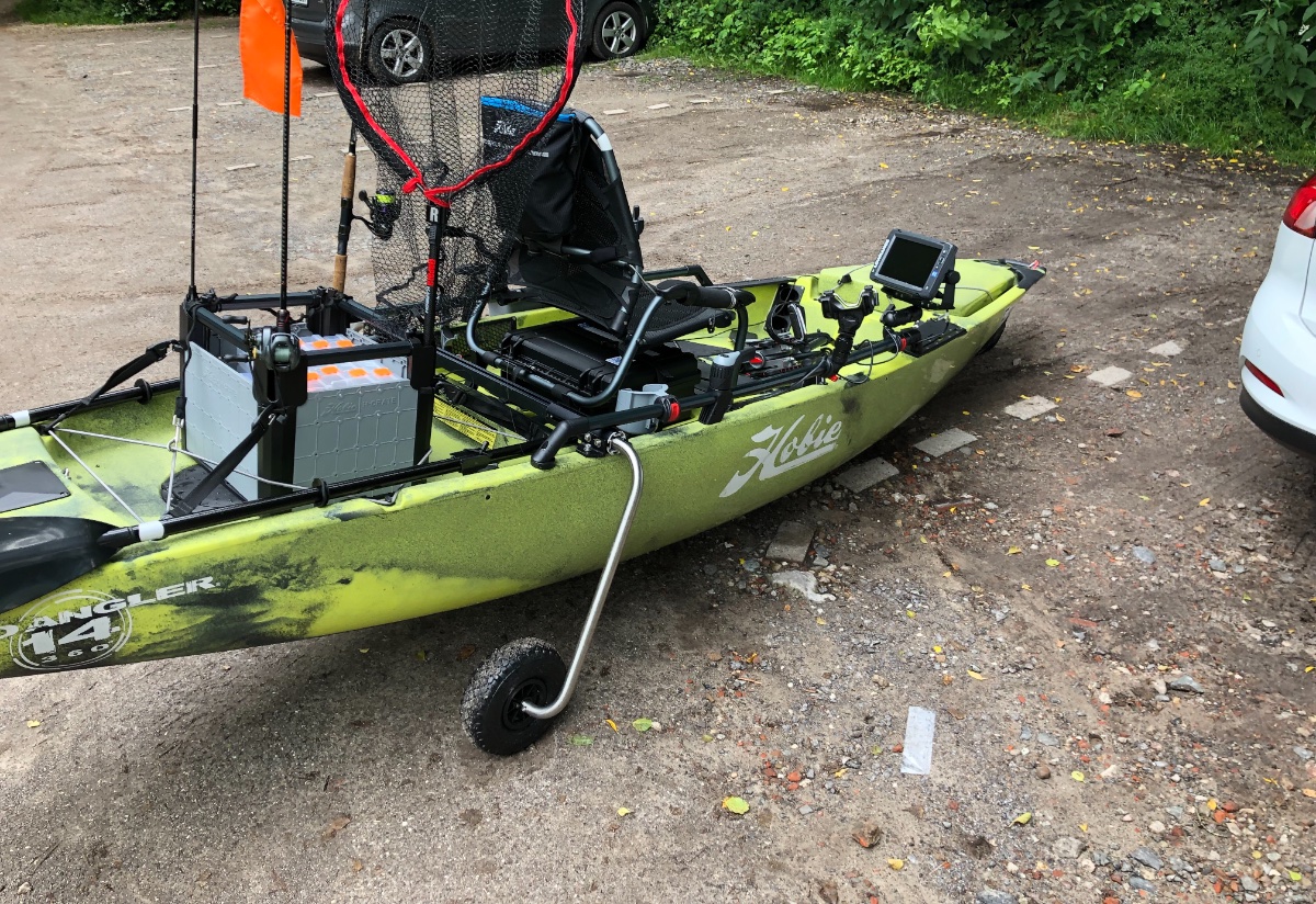Nun aber zum Kajak. Umgebaut ist noch nicht viel. Lediglich das Boonedox Landing Gear, der Geber vom Lowrance Elite 9 TI2 sowie Berley Pro Bumper und Kielschutz verklebt. Zubehör hält sich auch noch in Grenzen (Wobei mir so viel nicht mehr einfällt): H-Crate (Soft-Cover ist bestellt), Hobie Vantage Seat Tasche, Scotty R9 Rutenhalter mit H-Rail Aufnahme, Hobie Tackle Bin, Hobie Flagge mit Leuchte, Rampala Kescher, NRS Chinook mit Messer, Hobie Drive Bag und das normale Angelzeugs.