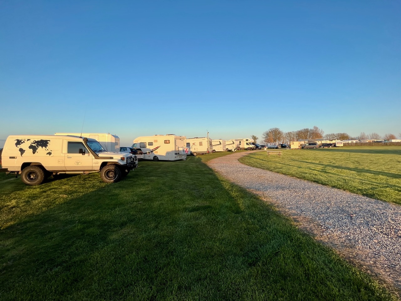 Trotz langem Wochenende sind nur die Deichplätze mit Meerblick belegt, die Wiese ist praktisch leer.