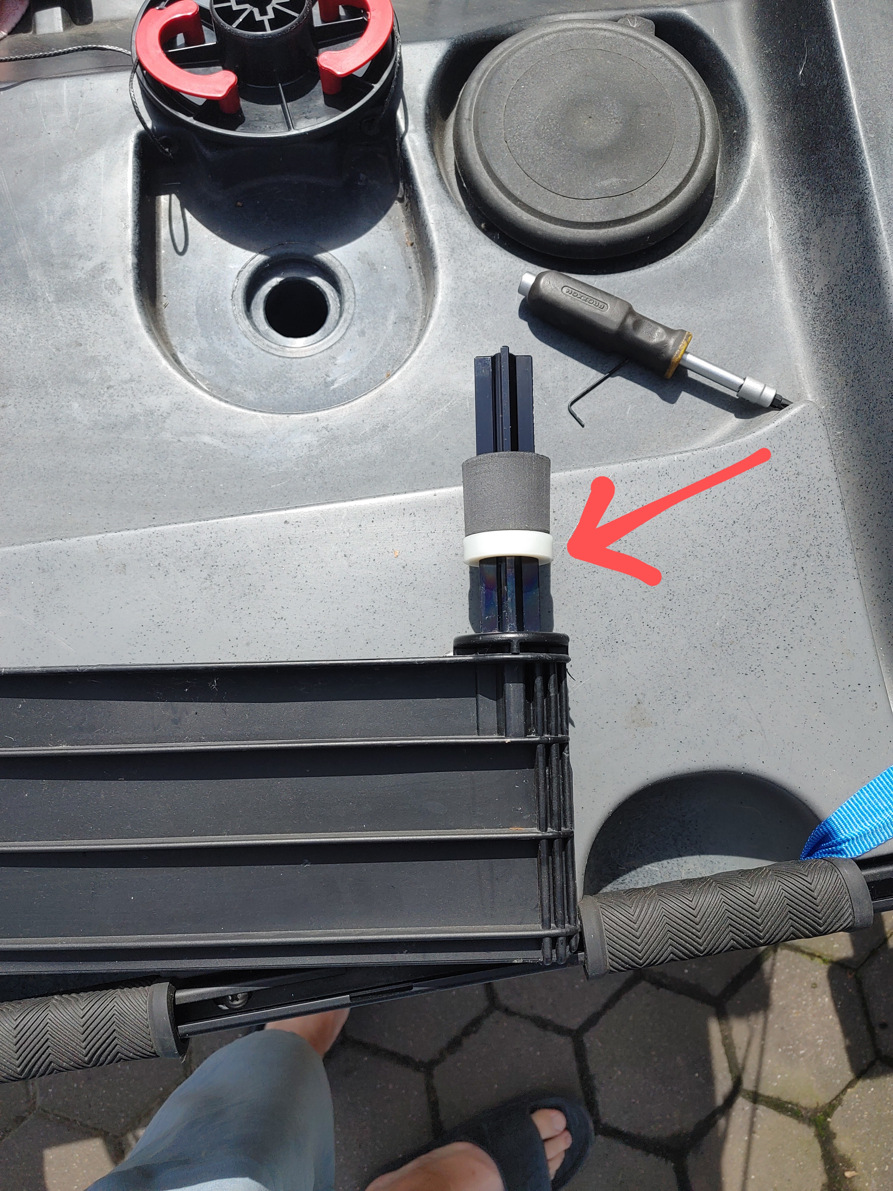 Dabei ist mir aufgefallen, dass beim Neukauf des Kayaks ein weißer Ring(vermutlich Teflonbuchse) mitgeliefert wurde. Ich hatte diesen Ring nie montiert gehabt, da er in der Anleitung nicht aufgeführt wird. Vom Durchmesser her könnte er aber zum Ruder (siehe Foto) passen.