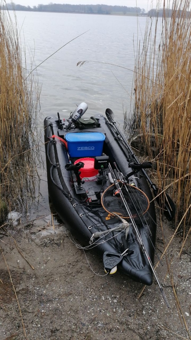 Bemängeln muss ich nur die Sitzposition. Eindeutig viel zu niedrig. Habe mich dann auf die Zebco Fischkiste gesetzt, dazu ein Brett raus. War aber auch immer noch unbequem mit Watbüx, dicker Jacke und Feststoffschwimmweste. Dann auch noch mit Winterspeck..... Und zu viel Zeuchs dabei.... Eimer, Tasche, usw.