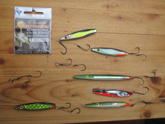 Eine weitere Variante spukt mir im Kopf herum zum Jiggen auf Dorsch: Doppelhaken im oberen Ring eines Tönnchenwirbels vor dem Köder, so dass der Blinker frei drehen kann und die Haken gerade in der Strömung hängen. Möglicherweise kommt es aber hier zu Verwicklungen der Haken im Vorfach , konnte ich noch nicht ausprobieren. Es wird nachberichtet.