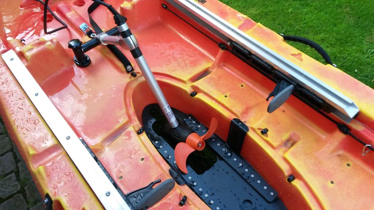 Moin, der Weserabschnitt vor meiner Haustür ist sehr strömungsreich. Um beim drillen besser manövrieren zu können, habe ich mich dazu durchgerungen einen kleinen Hilfsmotor zu installieren. Das Big Tuna verfügt über eine relativ große Öffnung im Rumpf. Hier gehört normalerweise eine Wanne zum Hältern von Fischen rein. Da ich diese Wanne nicht nutze, kam mir der Gedanke hier den Motor zu installieren. Also habe ich fix eine Halterung für den Motor und einen Einsatz für die Rumpföffnung gebastelt. Für die Motorfixierung habe ich zwei Lenzlöcher geopfert. Der Motor lässt sich über diese Fixierung sehr schnell montieren.