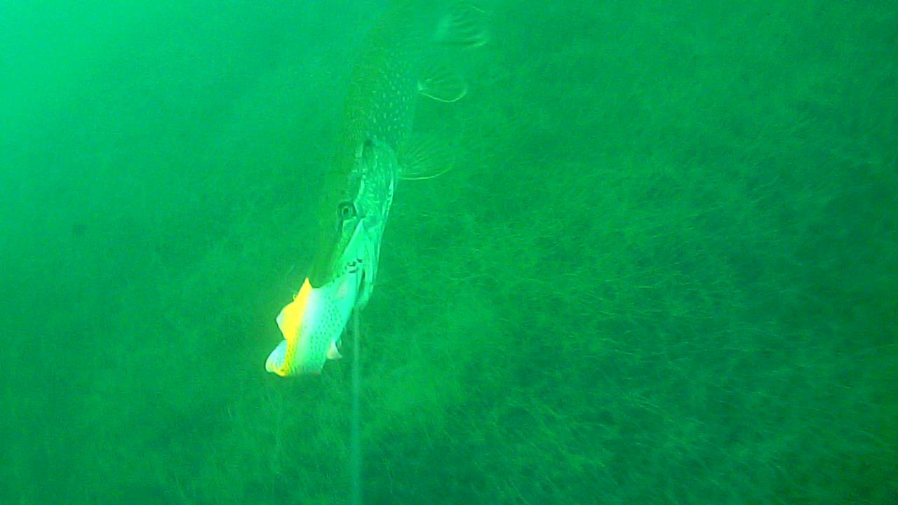 Hecht beißt auf Köfi und die Schnur reißt mitsamt der Kamera. Nach einer gewissen Zeit beißt der Hecht aber erneut auf einen anderen Köfi und wird mit der Kamera gelandet.