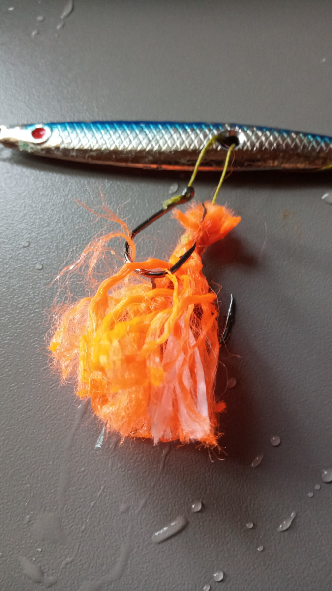 Der orange Puschel scheint mir etwas mächtig, darum erstmal nur ein geschmückter Haken. Die Maurerschnur scheint mir etwas mager, na schauen wir mal