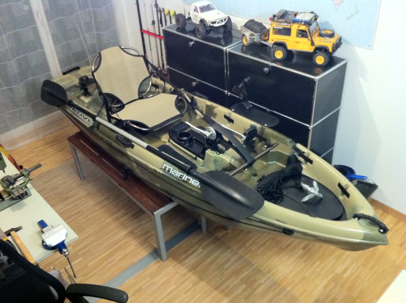 Nun stehts erst mal im Bastelzimmer. Sitzposition einstellen, ein paar Sachen anschrauben, Kiste für Tackle-Zeug und anderes montieren, ein Transportrad basteln damit ich es nicht immer rumtragen muss, und und und. ... der erste Ausflug steht dann nächste Woche an
