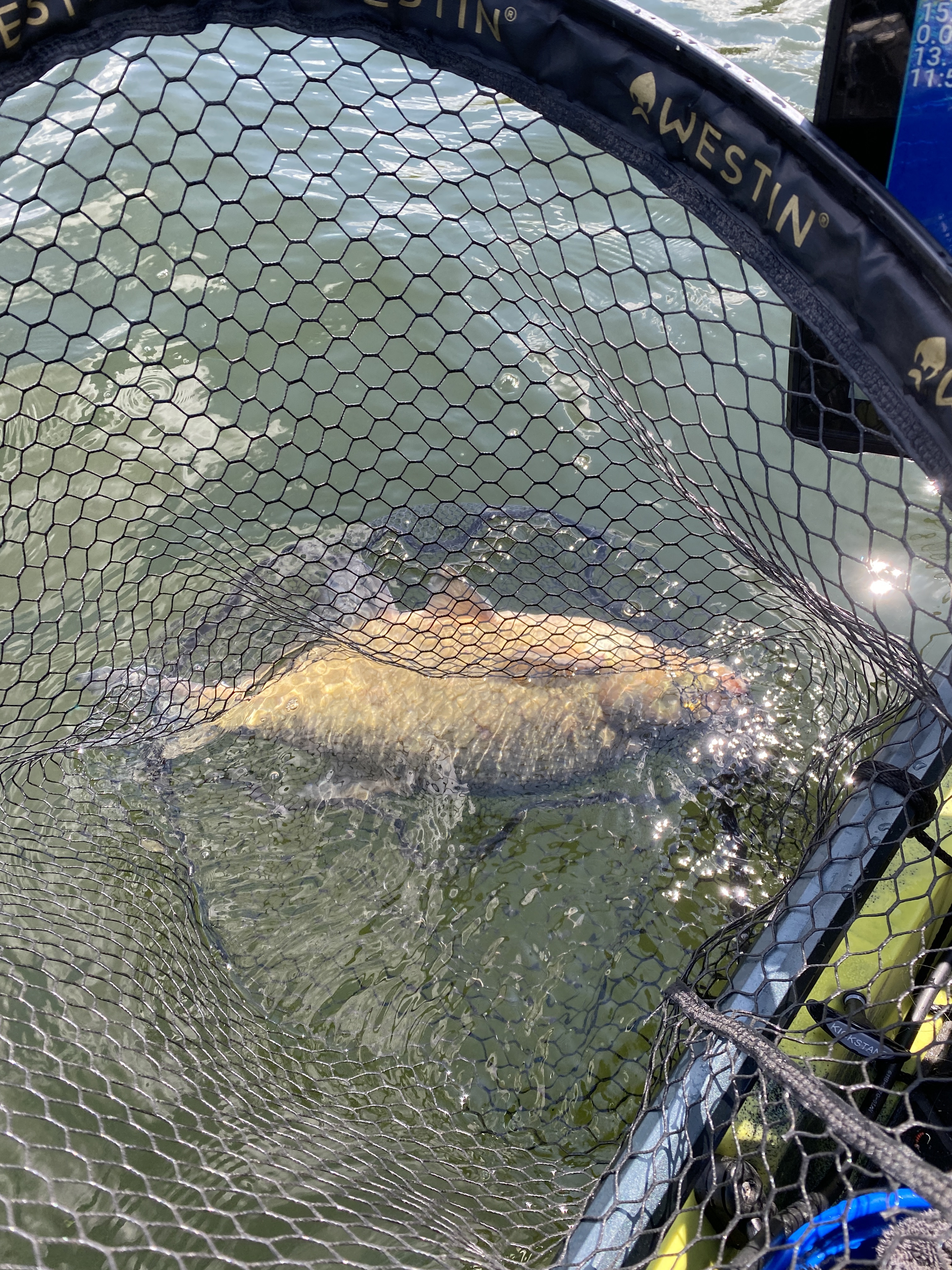 Die Brasse hat den Köder fast unter dem Kajak bei ca. 5 m Tiefe selbstbewusst genommen. Nach einem spannenden Drill konnte ich die Brasse keschern.
