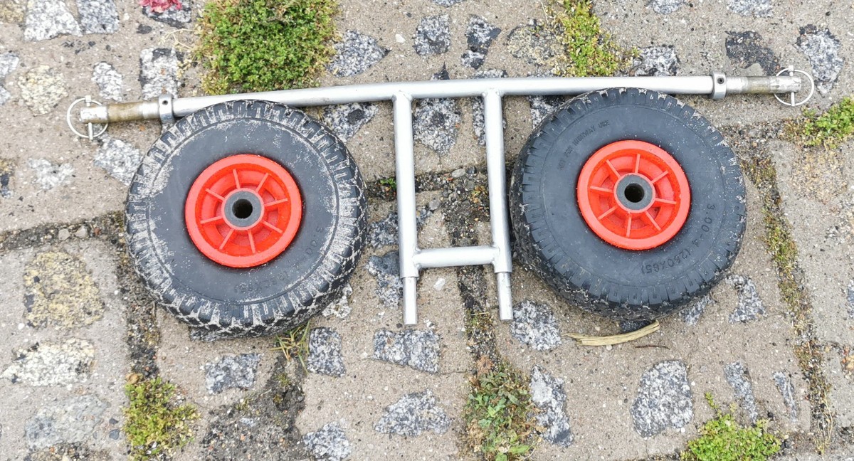 Hier nochmal ein paar Details vom Trolley. Hab ich mit dem Kayak bekommen, vielleicht ein Eigenbau? Räder sind schlauchlose wie von der Sackkarre.
