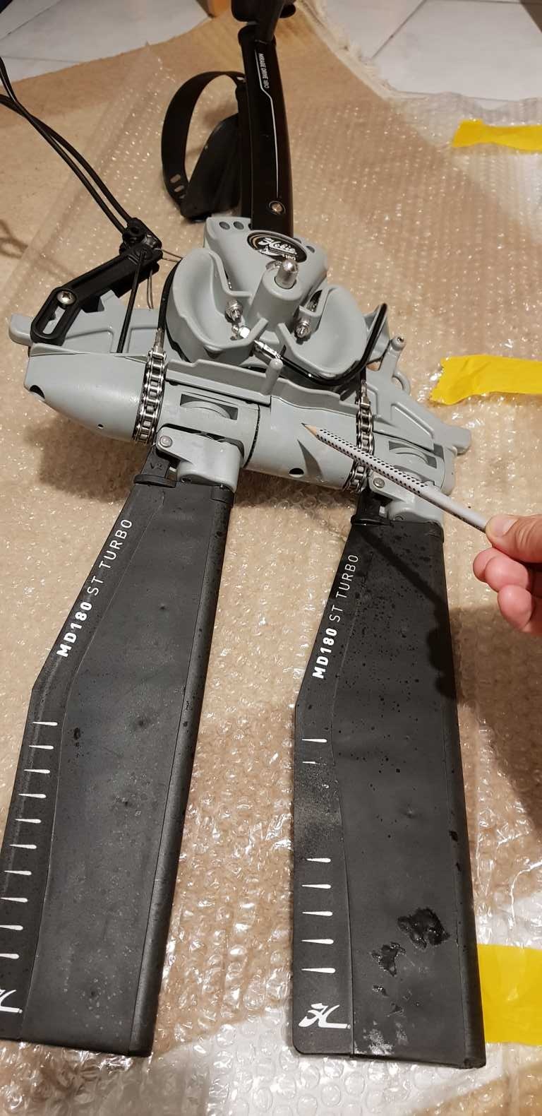 zu deiner Frage: im Inneren jeder Flosse steckt eine Metallstange. Diese hat am unteren Ende eine Gewindeschraube. Das Ganze wird erst sichtbar, wenn man die Flosse vom Antrieb löst. Sprengring raus - Bolzen raus - Flosse nach unten abziehen.