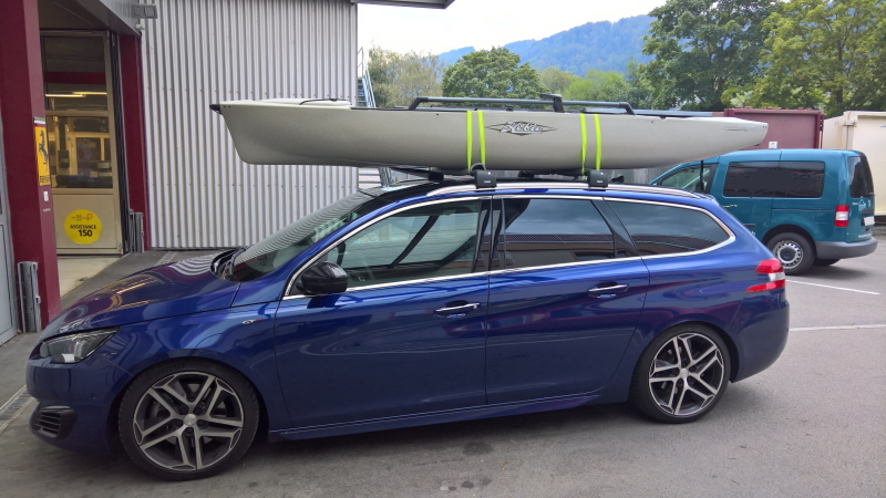 Das Aufladen aufs Autodach (und auch das Abladen) habe ich mir schwieriger und anstrengender vorgestellt. Habe es alleine gemacht. Ich habe es einfach mit dem Bug nach oben seitlich zwischen die Dachträger gestellt (Decke drunter gelegt) und dann rauf geschoben und gedreht. Runter ging es genau so...