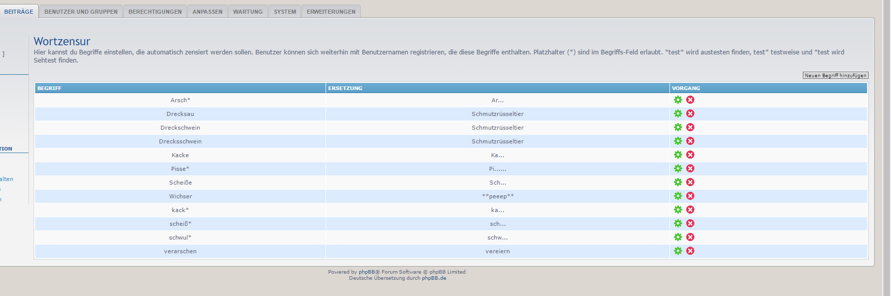Es sind gerade einmal 12 Worte, die nicht so erscheinen, wie sie geschrieben wurden. Noch dazu bleibt durchaus erkennbar was geschrieben wurde. Unter Zensur verstehe ich etwas anderes. Und wie vatas-sohn schon schreibt: Wir machen es seit Jahren so und niemandem ist es bislang überhaupt nur aufgefallen. Das spricht durchaus für die Umgangsformen in diesem Forum. Wenn die sich geändert hätten, hätten wir die Liste vielleicht sogar irgendwann einmal erweitert. Nichteinmal das war nötig, seit wir sie einmal eingestellt haben. Das diese Wortersetzung leicht ausgehebelt werden kann, ist auch klar. Aber das Team hat ja auch noch ein Auge auf die Beiträge, wenn es mal nötig sein sollte.
