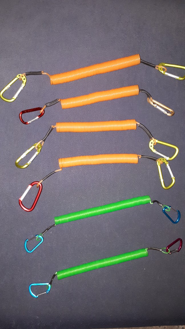 Die grüne 2mm Trimmerschnur ist aus dem Baumarkt, 15 Meter für 2,99€ . Die Länge der Paddelsicherungen beträgt knapp 3 Meter in die Länge gezogen und ca. 35cm im Ruhezustand. Die Karabiner haben bei Tedi unter 1€/Stk. gekostet. Gesichert habe ich die Enden mit Schrumpfschlauch, das hält die zu sichenden Gegenstände auf jeden Fall.