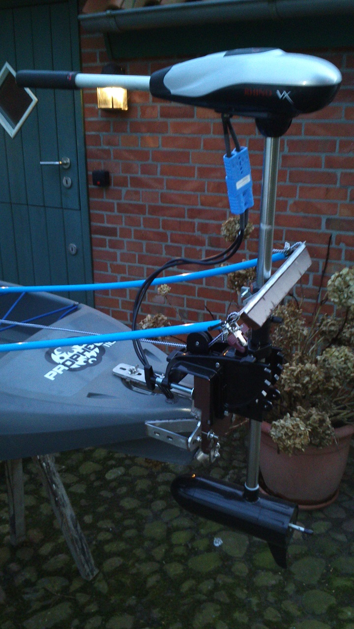 Ich kaufte mir einen speziellen E-Motor für Kajaks zum Nachrüsten im Angelladen. (den Watersnake T-18 SW mit 18LB)