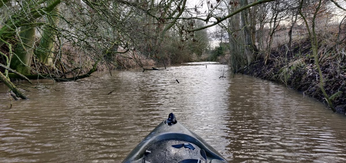 Auch das Angeln vom Kajak wollte ich testen. Spinnfischen ist hier jedoch derzeit nicht erlaubt, außerdem bin ich mir noch nicht sicher, ob es in diesem flachen Gewässerabschnitt überhaupt maßige Hechte oder große Barsche gibt. Bei jeder Fahrt habe ich jedoch stets an derselben Stelle einen Schwarm dicker Brassen aufgescheucht.