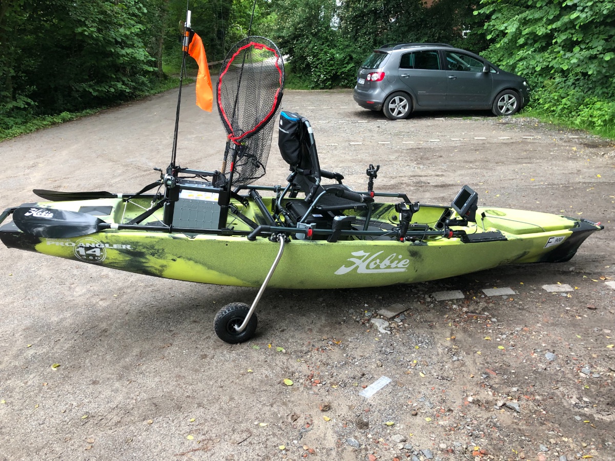 Nun aber zum Kajak. Umgebaut ist noch nicht viel. Lediglich das Boonedox Landing Gear, der Geber vom Lowrance Elite 9 TI2 sowie Berley Pro Bumper und Kielschutz verklebt. Zubehör hält sich auch noch in Grenzen (Wobei mir so viel nicht mehr einfällt): H-Crate (Soft-Cover ist bestellt), Hobie Vantage Seat Tasche, Scotty R9 Rutenhalter mit H-Rail Aufnahme, Hobie Tackle Bin, Hobie Flagge mit Leuchte, Rampala Kescher, NRS Chinook mit Messer, Hobie Drive Bag und das normale Angelzeugs.