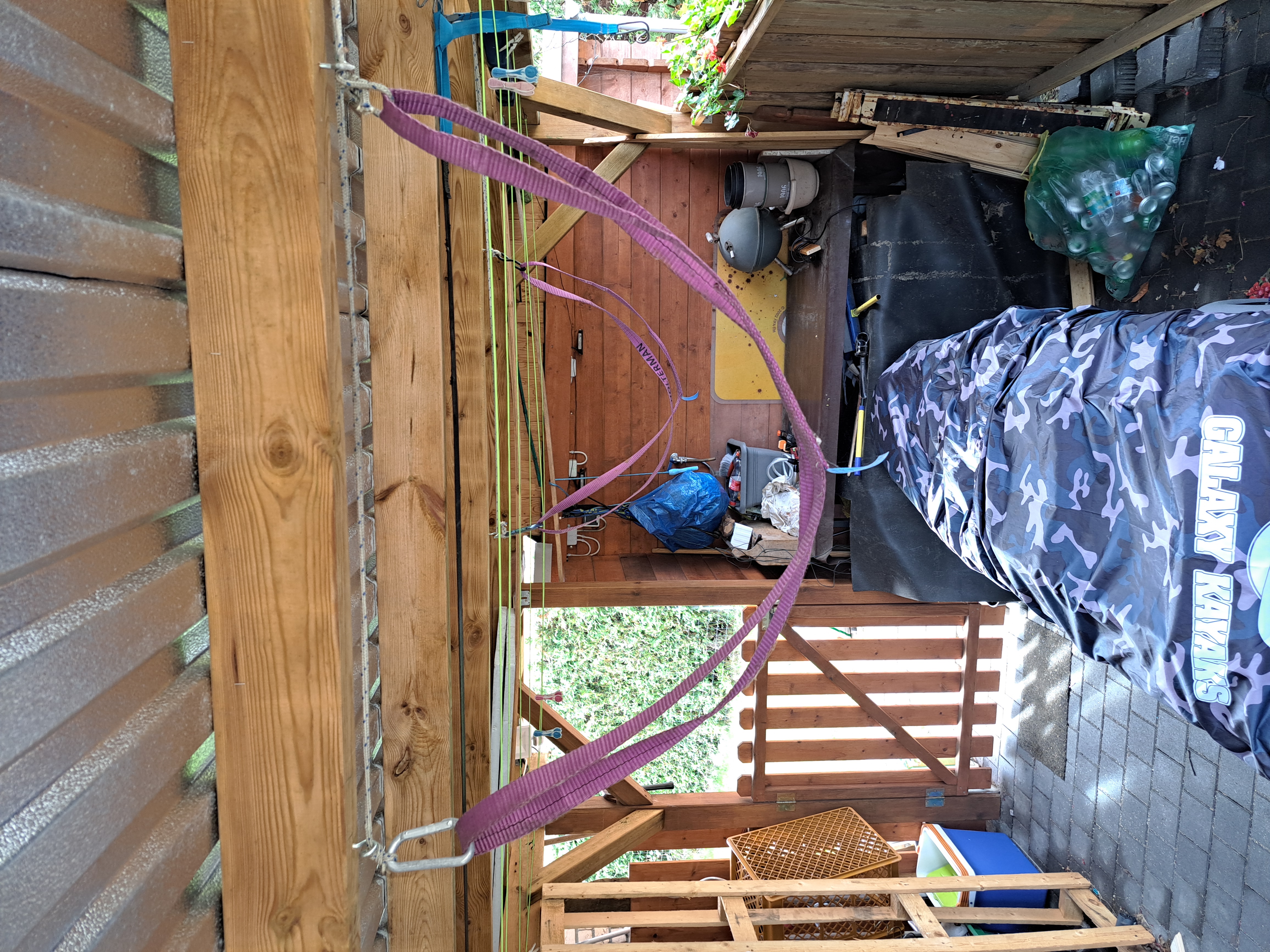 Die Winde hängt, die Gurt-Umlenkrolle passt und der Gurt ist lang genug das ganze Carport zu Queren. Auf der anderen Seite fehlen jetzt noch 4 Unlenkroĺlen die wiederum zu weiteren 4 Umlenkrollen führen, wo die Seile zu den Gurten der Bootslagerung gehen. Und diese Goldenen Umlenkrollen konnt A nicht rechtzeitig liefern...😪