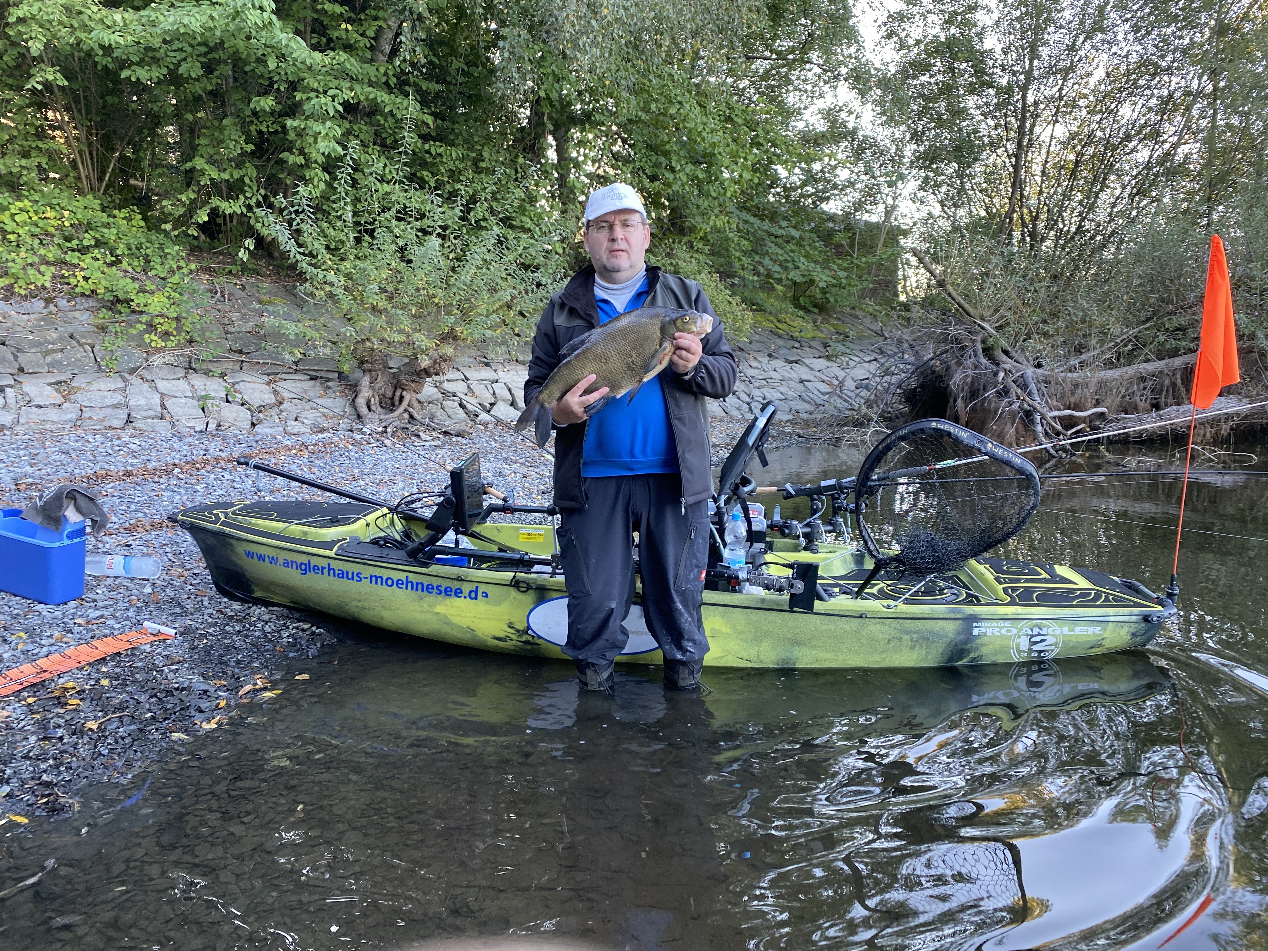 Die Brasse hat den Köder fast unter dem Kajak bei ca. 5 m Tiefe selbstbewusst genommen. Nach einem spannenden Drill konnte ich die Brasse keschern.
