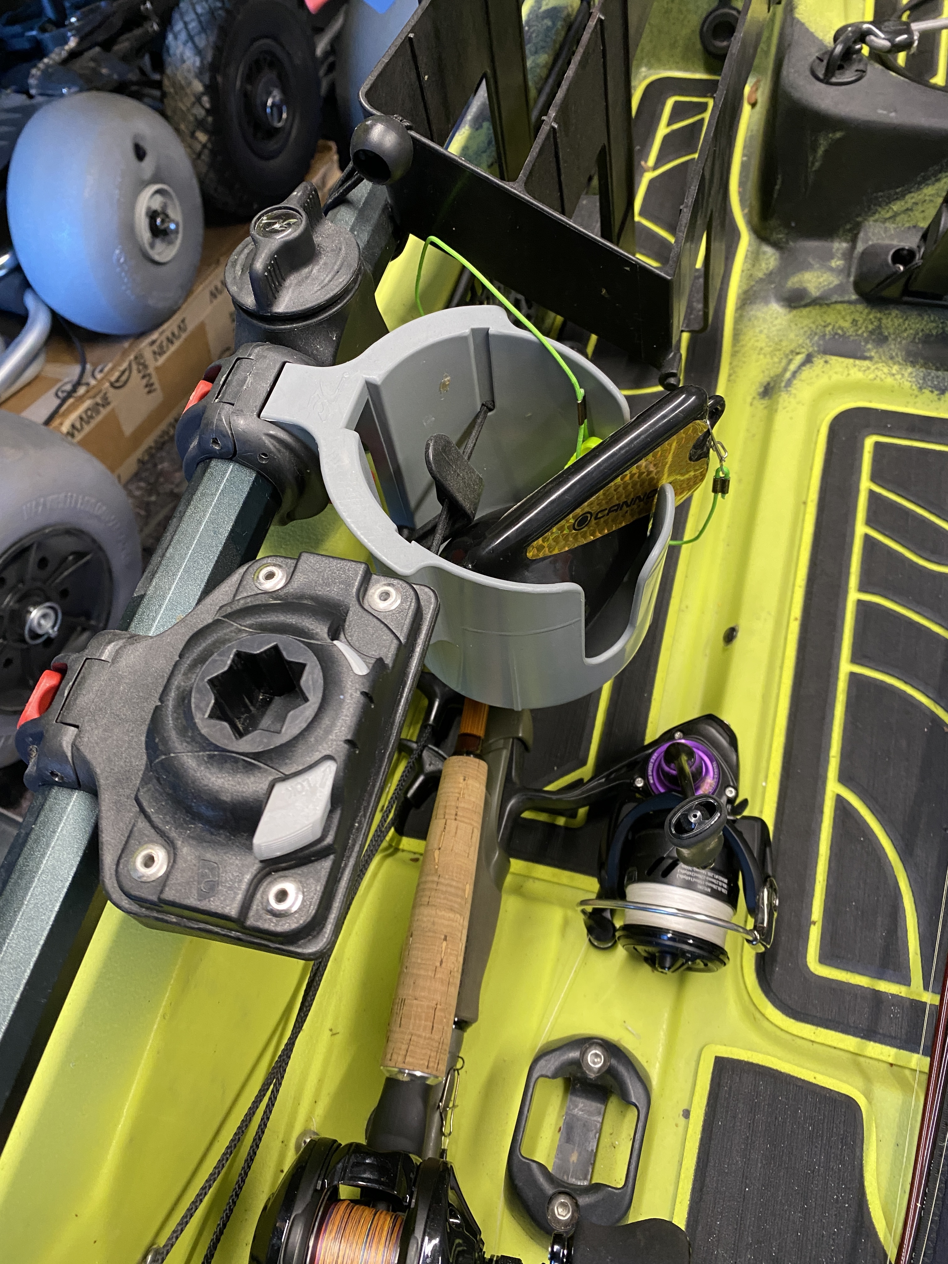 Am bequemsten ist es für mich bisher, dass das Downriggerblei direkt neben dem Downrigger an der Seitenwand im Kajak liegt.