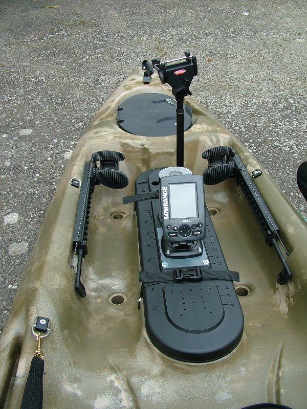 Weiterhin wurde ein Clip befestigt, der für den sicheren Halt des Keschers sorgen soll - er ist für verschiedene Keschergrößen ausgelegt und hält (zumindest in der Garage) zuverlässig. Ein Rutenhalter fürs Schleppfischen mit Wobblern und Gummifischen wurde „höher gelegt“ und das Echolot so installiert, dass ich es am Anfang problemlos bedienen kann, ohne gleich eine Brille zu benötigen. Eventuell wird das Teil später noch versetzt – aber solange ich noch keine Routine bei der Bedienung habe, wird es an dieser Stelle bleiben. Paddel- und Rutensicherungen sind ebenfalls verbaut. Die Spiralkabel stammen von ausgedienten Telefonen. Die PVC-Ummantelung wurde mit einem Lösungsmittel verklebt und mit Schrumpfschlauch gesichert. Am Kajak werden die Sicherungen mit Karabinern befestigt und an den Ruten sind vorerst Schlüsselringe mit Kabelbindern angebracht, an denen die Spiralkabel mit kleinen Schlüssel-Karabinern eingehängt werden. Wird fortgesetzt…