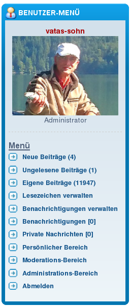 Dann log dich doch mal aus...vatas-sohn hat geschrieben: 9. Mai 2019, 06:19Ich seh` da nix!Bernd R. hat geschrieben: 8. Mai 2019, 21:15 Jetzt sollte es auch wieder in der Benutzer-Menü-Box im Portal mit dem Einloggen klappen. Die Macher des Portals haben einen Fix gepostet.![]()