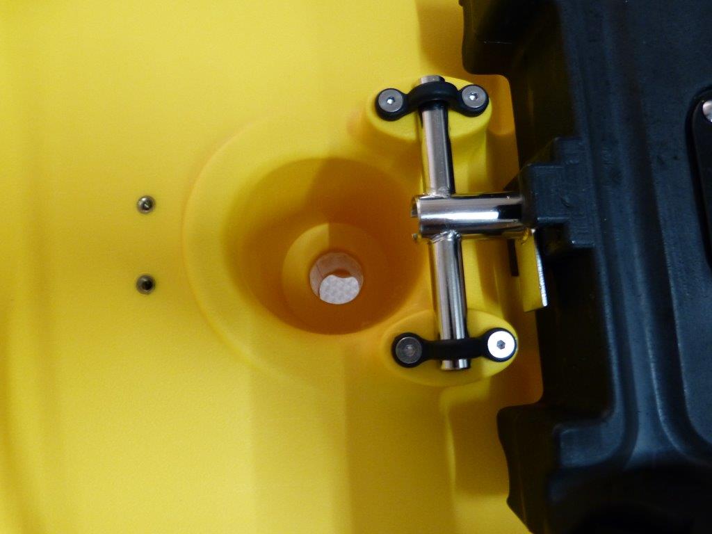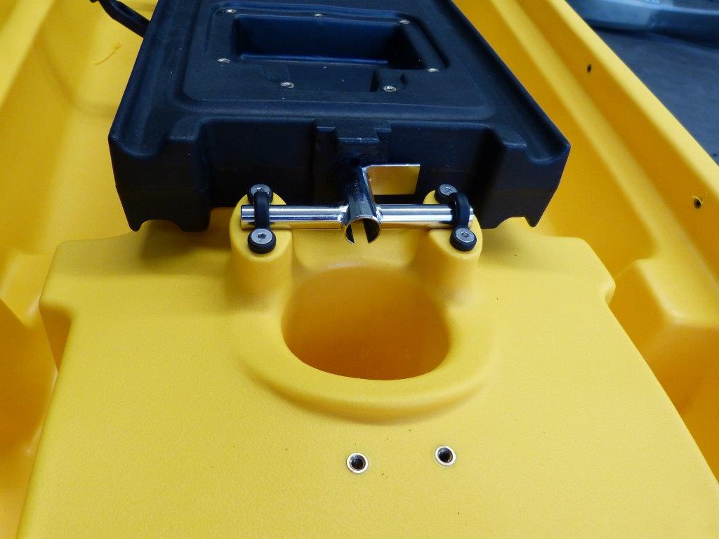 Hier ein paar Bilder vom Transducer Slot ( ist in der Mitte vom Boot und groß genug für alle Muliti... Quadra irgendwas Gebergeschichten), die Achse auf der der Deckel dreht ist hohl und der Raum dahinter hat einen fest verschraubten Deckel mit Dichtung. Also kannst du die Kabel direkt in den Deckel führen ( Stecker müssen aber wohl ab)