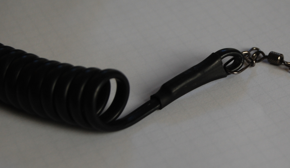Ich mag`s nicht und habe die Sicherung aus Spiralkabel (Telefonkabel) gemacht, die Enden einfach umgelegt und so eine Öse gebildet. Mit Bindegarn gesichert und einen schwarzen Schrumpfschlauch drüber- hält wie Bombe und ich finde, daß das einigermaßen gut ausschaut.