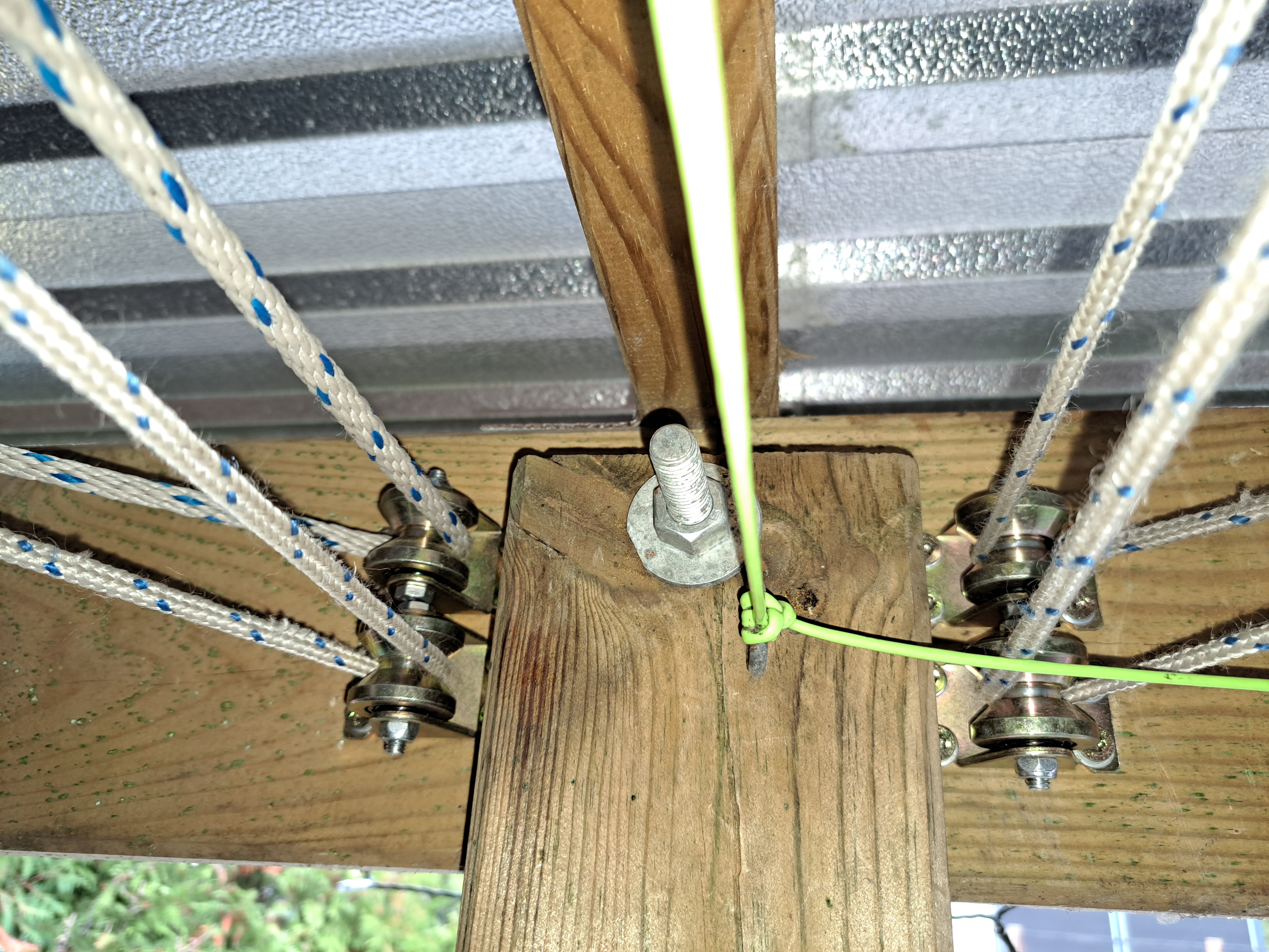 Die Winde hängt, die Gurt-Umlenkrolle passt und der Gurt ist lang genug das ganze Carport zu Queren. Auf der anderen Seite fehlen jetzt noch 4 Unlenkroĺlen die wiederum zu weiteren 4 Umlenkrollen führen, wo die Seile zu den Gurten der Bootslagerung gehen. Und diese Goldenen Umlenkrollen konnt A nicht rechtzeitig liefern...