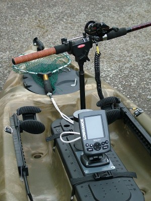 Ein Rutenhalter fürs Schleppfischen mit Wobblern und Gummifischen wurde „höher gelegt“ und das Echolot so installiert, dass ich es am Anfang problemlos bedienen kann, ohne gleich eine Brille zu benötigen. Eventuell wird das Teil später noch versetzt – aber solange ich noch keine Routine bei der Bedienung habe, wird es an dieser Stelle bleiben.