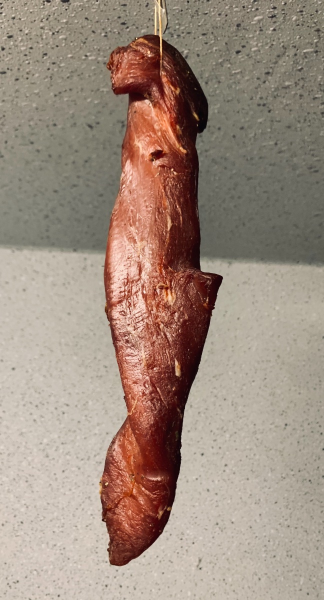 Deutlich weniger Zucker (minus 90%) in der Pökelmasse, deutlicher länger gepökelt (drei Wochen anstatt sieben Tage), dann mit zwei Tagen bei 5 Grad doppelt so lange durchgebrannt und anschließend bei 16 Grad noch drei weitere Tage getrocknet (hatte ich beim Bacon gar nicht gemacht). Zusätzlich ist jetzt eine Temperatursteuerung über den InkBird am Start, so dass ich konstant 15-20 Grad im Ofen habe