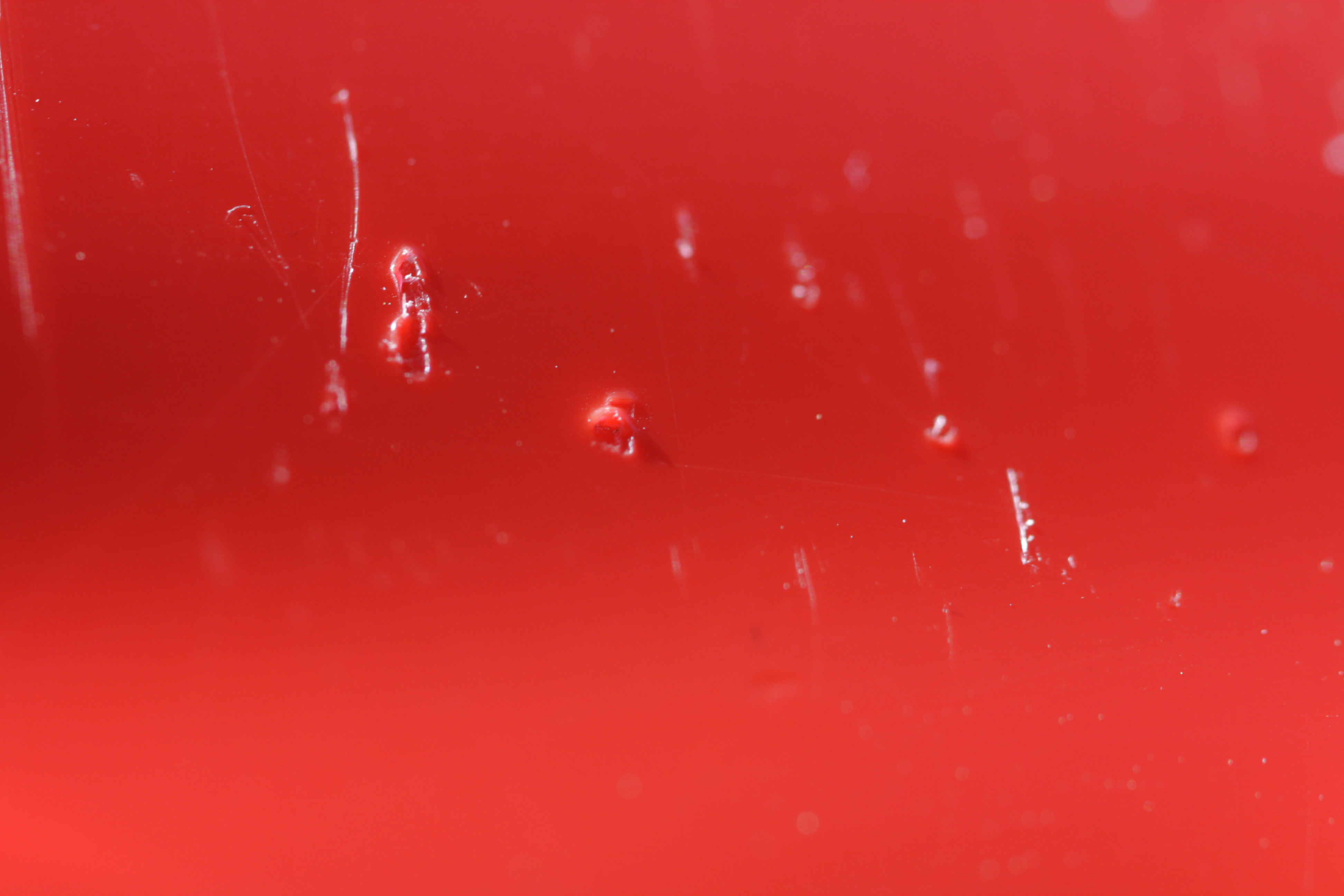 Dafür spricht auch, daß Du diese "Pickel" hast. Das sind Ausgasungen, die sich innerhalb eines Materials bilden können, wenn das Material nicht ausreagiert ist, bzw. Unverträglichkeiten/ aktive Reaktionen von Zuschlagstoffen (Färbemittel, Weichmacher etc.) im bestehenden Material stattfinden. Möglich ist auch, daß das Material nicht gut genug homogenisiert (gemischt) wurde. Auffallend dabei ist, daß diese Problematik ziemlich oft bei rot eingefärbten Kunststoffen zu beobachten ist. Welche Bestandteile da wie und warum reagieren, kann man eindeutig (wenn überhaupt, da zumindest das PE persistent ist!) im Labor klären.