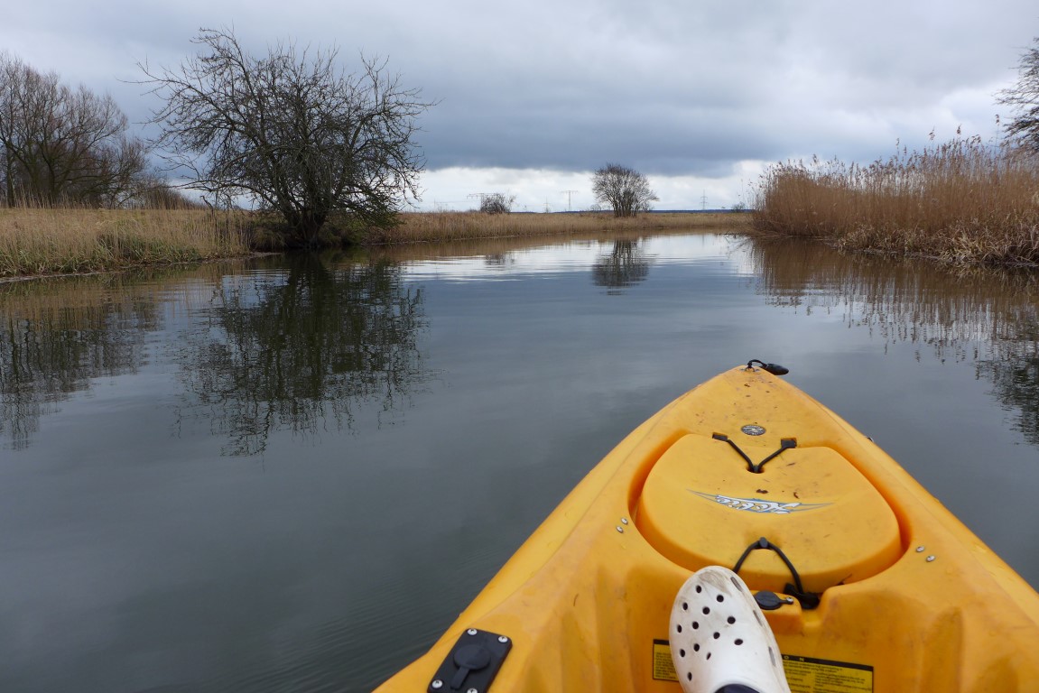 rahmenbedingungen: kleines flüsschen, so 10 meter breit, kaum mehr als 1,5 meter tief, strömung 1 km/h, windstill und kalt (3-4°C). ich wollte das gewässer mal kennenlernen, die ufer abspinnern und dabei nicht unbedingt strecke machen. etwas über 4 km bin ich stromaufwärts gefahren und hab mich dann wieder runter treiben lassen.