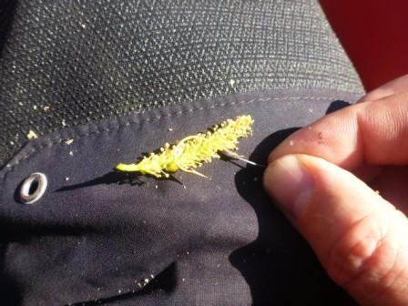 Körper ist aus Foam und nem Flashtinsel. Einmal gelber Tinsel mit grünem Foam und einmal grüner Tinsel mit gelbem Foam. Leider schwimmen die Trotz foam nicht so gut. Müsstest als am besten fetten. Der Haken ist ein Mefohaken. Denke der ist für sowas etwas schwer. noch mehr foam hätte doof ausgesehen. Und der Haken muss ja auch halten.