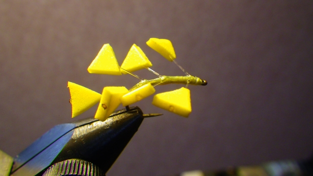 Aus Bastelfoam 3-4mm große Dreiecke schneiden und mit einer Nadel längs "vorbohren".