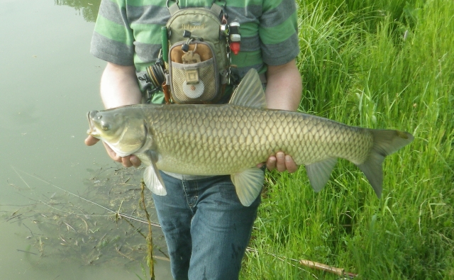 probiere mal sowas: Nach meiner Erfahrung ist bei solchen großen Grasfischfliegen die Konsistenz der Fliege sehr wichtig. Weiche Hasenfell oder Maraboufliegen fangen wesentlich besser als die strazigen, harten Muster. Die Grasfische testen die Fliege sehr häufig nur mit den Lippen. Wenn etwas nicht stimmt, wird die Fliege nicht eingesaugt. Eine kleine Fliege, die schön ins Grasermaul passt, ist auch sehr vorteilhaft. Wolly Bugger in olive, grün usw. fangen auch sehr gut.