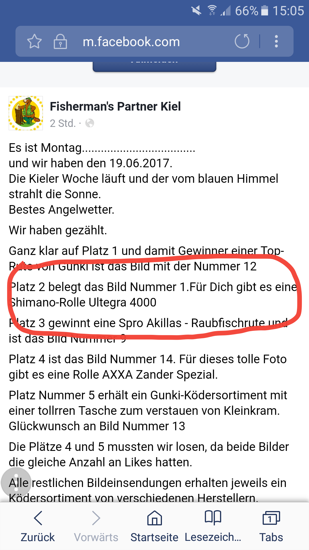 Im selben Monat gab es bei einem Tackeldealer um die Ecke ein Fotowettbewerb, dort konnte man ein Fangbild aus dem Monat Mai diesen Jahres einsenden. Voller Euphorie und ohne nachzudenken wurde ein Foto was meine Tochter (6) ausgesucht hat via Email eingeschickt. Die besten 15 Bilder werden auf Facebook eingestellt, damit sie dort bewertet werden können. Das Bild mit den meisten Kommentaren in Form der Nummer des Bildes soll gewinnen. Soweit so gut. Mein Bild ist nun mit unter den besten 15 gekommen, wie es mir via Email mitgeteilt wurde. Auf Facebook kann ich es nun ja nicht so recht verfolgen da ich so wie einige andere hier unter uns gar kein Facebook Account habe. Ich habe es mir über ein Arbeitskollegen angeschaut und festgestellt das Personen aus deren Freundeslisten dort für ihren Favoriten abstimmen. Hätte ich vorher gewusst das man die Größen Chancen hat wen man die größte Freundesliste hat, hätte ich nicht dran teilgenommen. Mein ernüchternes Fazit : keine Facebook mit Freundesliste keine Möglichkeit zu Gewinnen. Ich habe einige Zeit darüber nachgedacht es einfach unter Shit Happens abzuhaken. Aber andererseits wer nicht wagt der nicht gewinnt. Daher wende ich mich nun an euch, um wenigsten eine kleine Chance auf ein Kommentar für mein eingereichtes Bild zu bekommen.